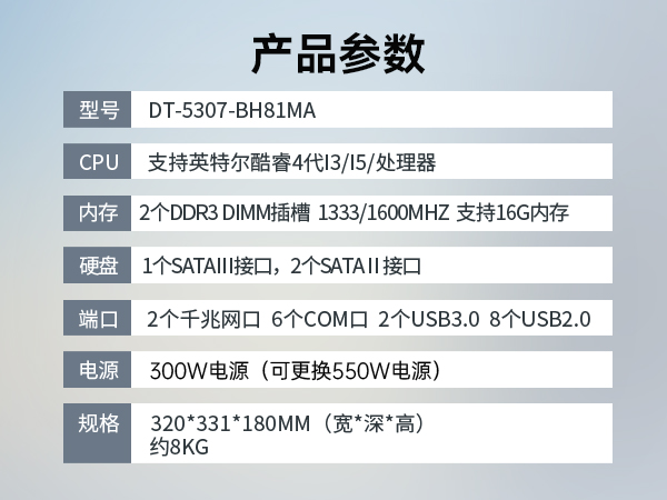PA视讯工控DT-5307-BH81MA是一款壁挂式工控机,采用酷睿4代13/15/17处理器,内存2个DDR3,支持16G。300W额定电源。单面出线,支持7个扩展槽,2个千兆网口,6个COM口,支持多种操作系统,欢迎定制。
